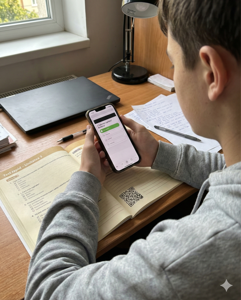 Tocmai de asta există lecții scurte și test QR: îl țin conectat, nu îl îneacă în teorie.